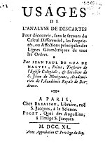 Jean Paul de Gua de Malves (1713, Malves-en-Minervois (Aude) – June 2, 1785, Paris) was a French mathematician who published in 1740 a work on analytical geometry in which he applied it, without the aid of differential calculus, to find the tangents, asymptotes, and various singular points of an algebraic curve.