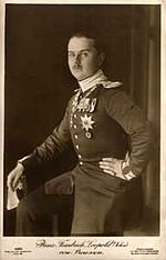 Joachim Karl Wilhelm Friedrich Leopold Prinz von Preußen (14 November 1865 in Berlin – 13 September 1931 Krojanke manor, Landkreis Flatow, Posen-West Prussia) was a son of Prince Frederick Charles of Prussia and Princess Maria Anna of Anhalt-Dessau, married in 1854.