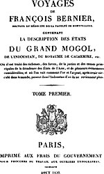 Author: François Bernier Source: François Bernier, Voyages de François Bernier, Docteur en médecine de la faculté de Montpellier. Contenant la description des états du Grand Mogol, de l'Indoustan, du royaume de de Cachemire, etc., TOME PREMIER, PARIS, Imprimé aux frais du gouvernement pour procurer du travail aux ouvriers typographes, AOUT 1830.