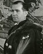 Although effectively subordinate to János Esterházy in the party, Jaross became a well-known international figure, notably accepting an invitation to London from the Hungarian Committee of the House of Commons to present Hungarian grievances along with fellow United Hungarian Party MP Géza Szüllo.Moving to Hungary in 1938 he joined the government of Béla Imrédy as Minister for Regained Territories and was one of the 18 deputies who formed the Party of Hungarian Renewal in 1940 (a far right dissident group of the governing party).
