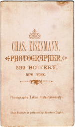 Charles Eisenmann (October 5, 1855 – December 8, 1927) was a famous New York photographer during the late 1880s who worked in the Bowery district.Eisenmann's photography was sold in the form of Cabinet cards, popular in this era, available to the middle class.
