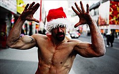 His costume consists of nothing but shorts, boots, and a red-and-white Santa hat, even during Toronto's winters.