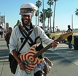 Harry Perry (born Harold Arthur Perry, May 19, 1951 in Washington, D.C., United States) is an African-American musician, Venice Beach boardwalk busker, known primarily for playing an electric guitar on inline skates or landroller skates (which have two large wheels that are slightly inclined) at Venice Beach Boardwalk.