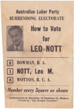 Leo Mervyn Nott (27 October 1915 – 19 September 1992) was an Australian politician and a member of the New South Wales Legislative Assembly between 1953 and 1968 and again between 1971 and 1973.