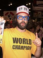 Earlier in his career he was recognized as "the hug guy" from the music video for the 2001 Dave Matthews Band single "Everyday".Friedlander is known for his distinctive look, which includes oversized glasses, shaggy hair, a T-shirt and trucker hat (both often emblazoned with slogans such as "world champion"), and a generally unkempt appearance.