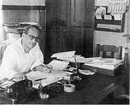 My father Dr PC Bagchi at work, photograph taken with Sudhir Khastogir (artist)