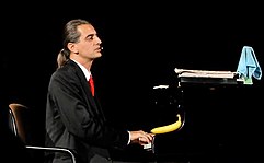 The most remarkable features in his performance are usually the presence and use of a grand piano.